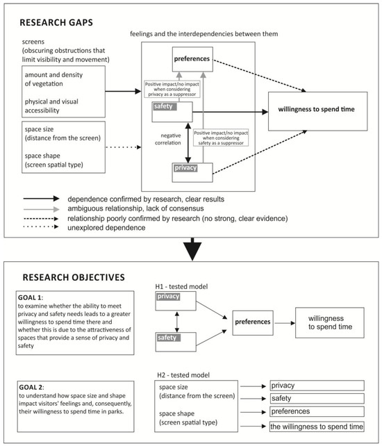 Meanwhile, well-organized park space, conducive to spending time, can significantly improve the quality of life and health of conurbation residents [26,27,28]. Based on this assumption, we decided to conduct research aimed at identifying the impact of selected park features and the feelings they evoke on the willingness to spend time there. The research plan addressed research gaps, including a lack of consensus and insufficient evidence for certain relationships (Figure 1). The current state of knowledge is presented in detail in this paper.