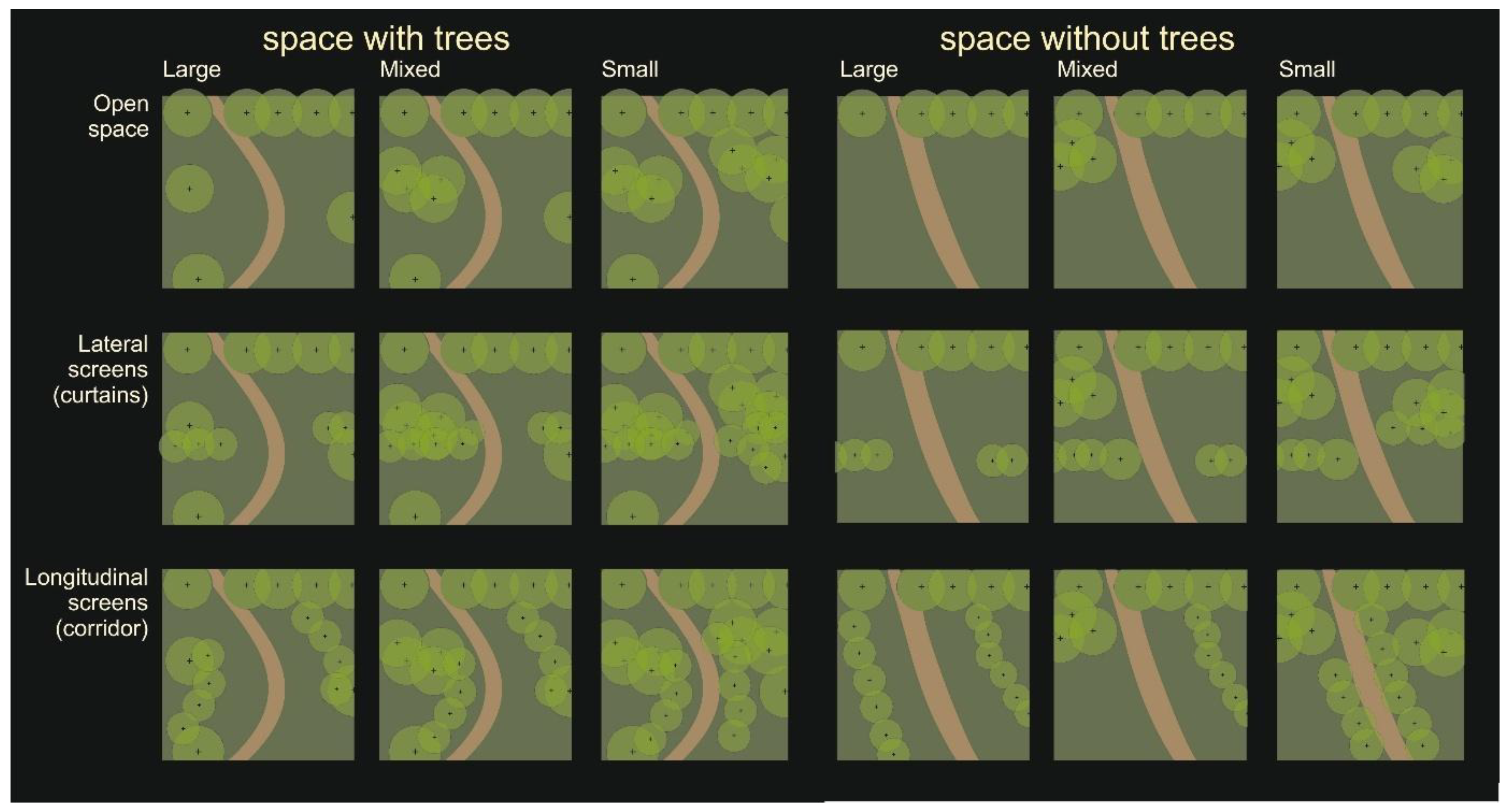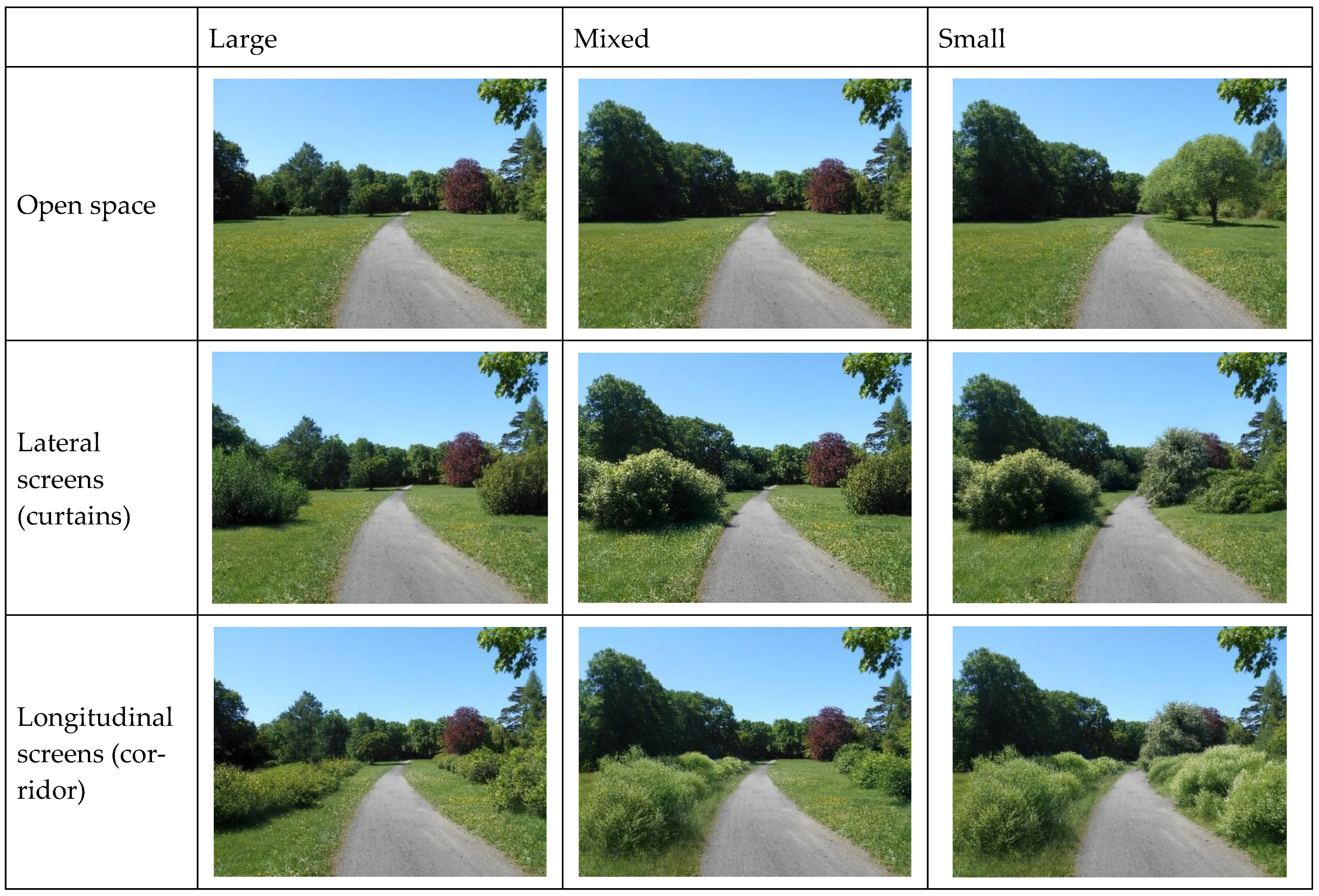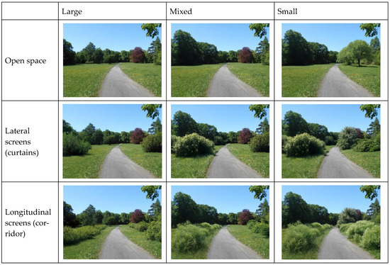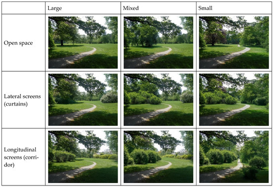 Participants assessed the photographs based on four criteria: sense of safety, sense of privacy, preference for the park landscape, and willingness to spend time in the area. The manipulation of predictors was grounded in two photographs of park spaces: one illustrating an open clearing and the other depicting a tree-lined park area. Both photographs depict a pathway, introduced to guide the primary viewing axis, thereby determining the orientation of the screens (either perpendicular or parallel to the path/viewing axis). Additionally, the presence of the pathway distinctly signifies the nature of the space being depicted—it is a park space, as opposed to, for instance, undeveloped green areas. These photographs were altered to create nine scenarios based on specific factors (Figure 3). The first factor was the size of the space, categorized into three options: large, small, or mixed (i.e., a space offering a combination of proximate and distant views). The second factor pertained to the shape of the space, with three configurations: open (without viewing screens), lateral screens (curtains), and longitudinal screens (corridors). The screens were positioned at varying distances from the path, contingent on the size of the space factor. In small spaces, the screens were situated near the path, thereby narrowing the field of view. Conversely, in large spaces, the screens were placed further from the path, allowing for open space along it. Mixed spaces exhibited some asymmetry. The outcomes of the manipulations for both photographs (space without trees and space with trees) are illustrated in Figure 4 and Figure 5.