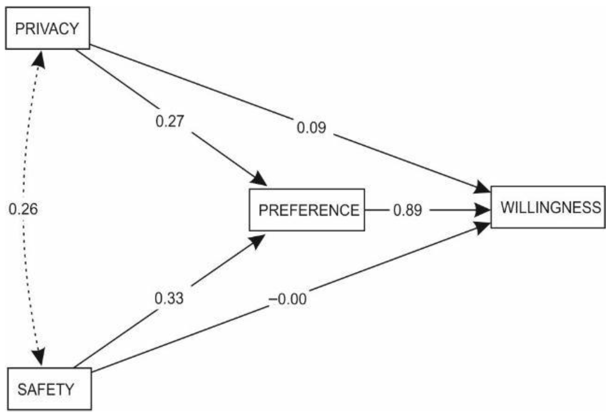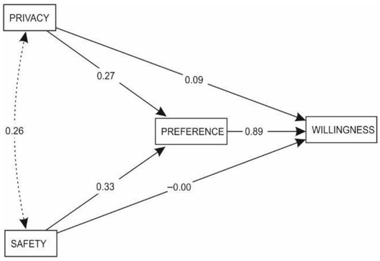 Figure 6. Mediation analysis where the relationship between privacy and safety and the willingness to spend time in the area is mediated by preference—path diagram.