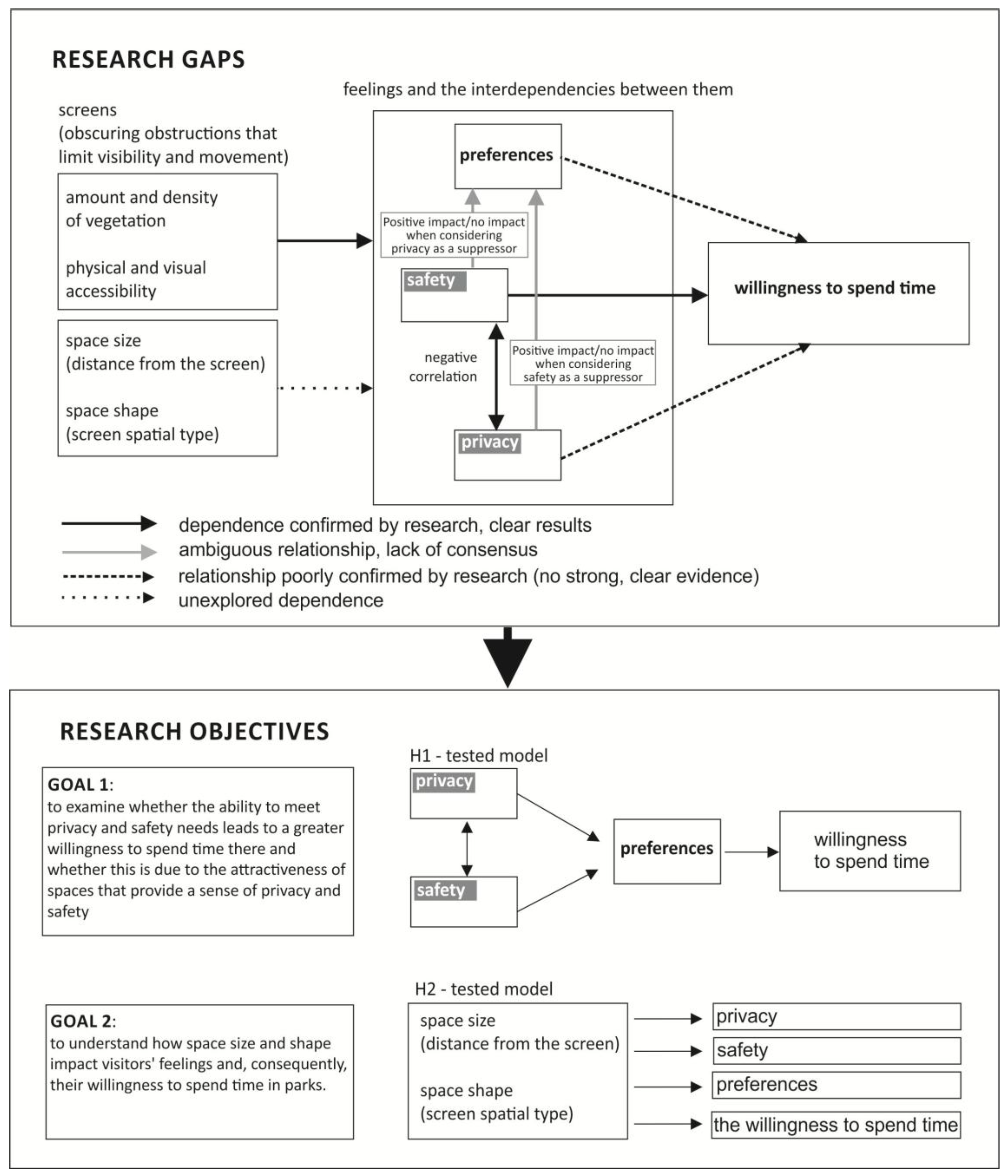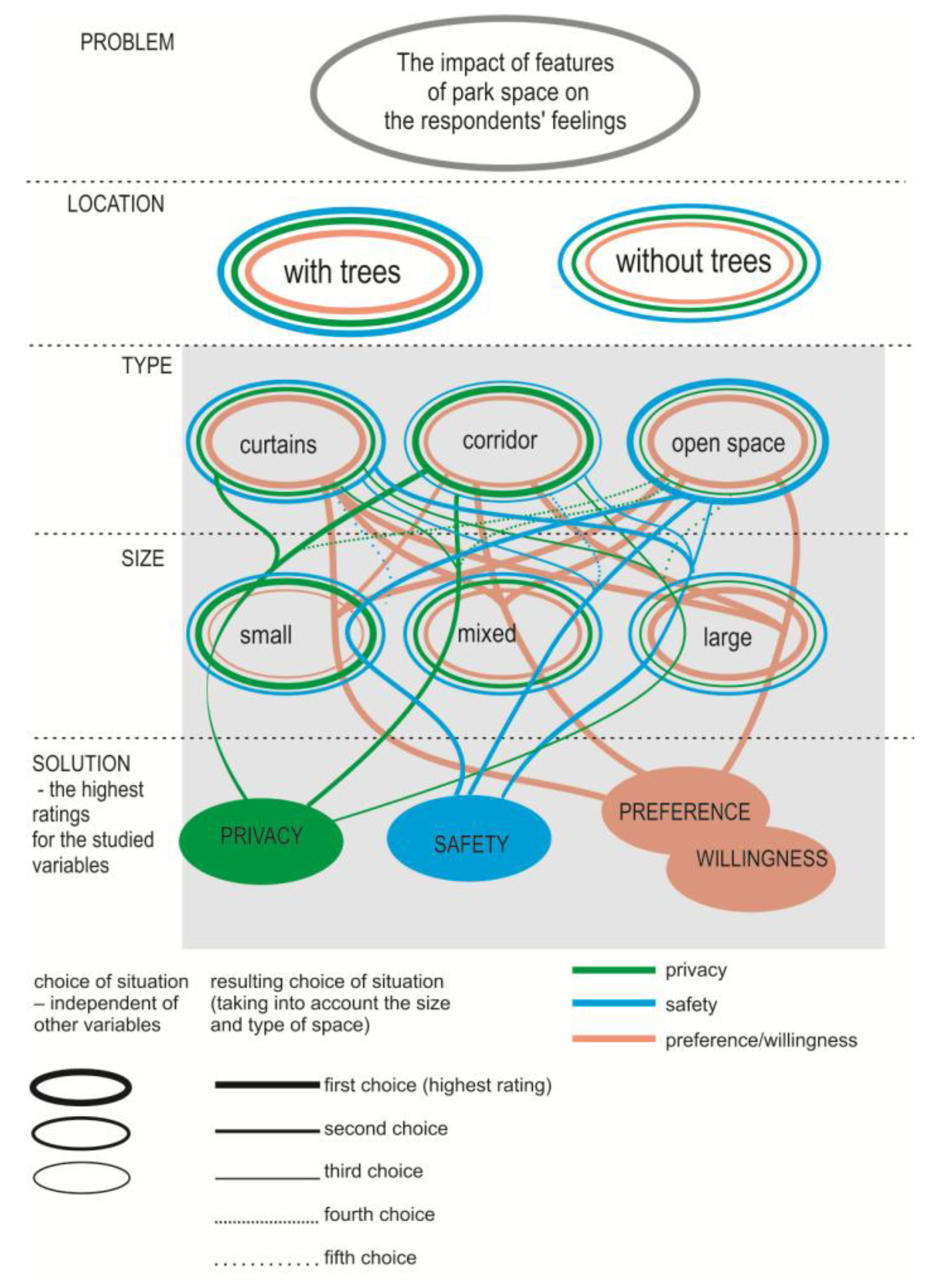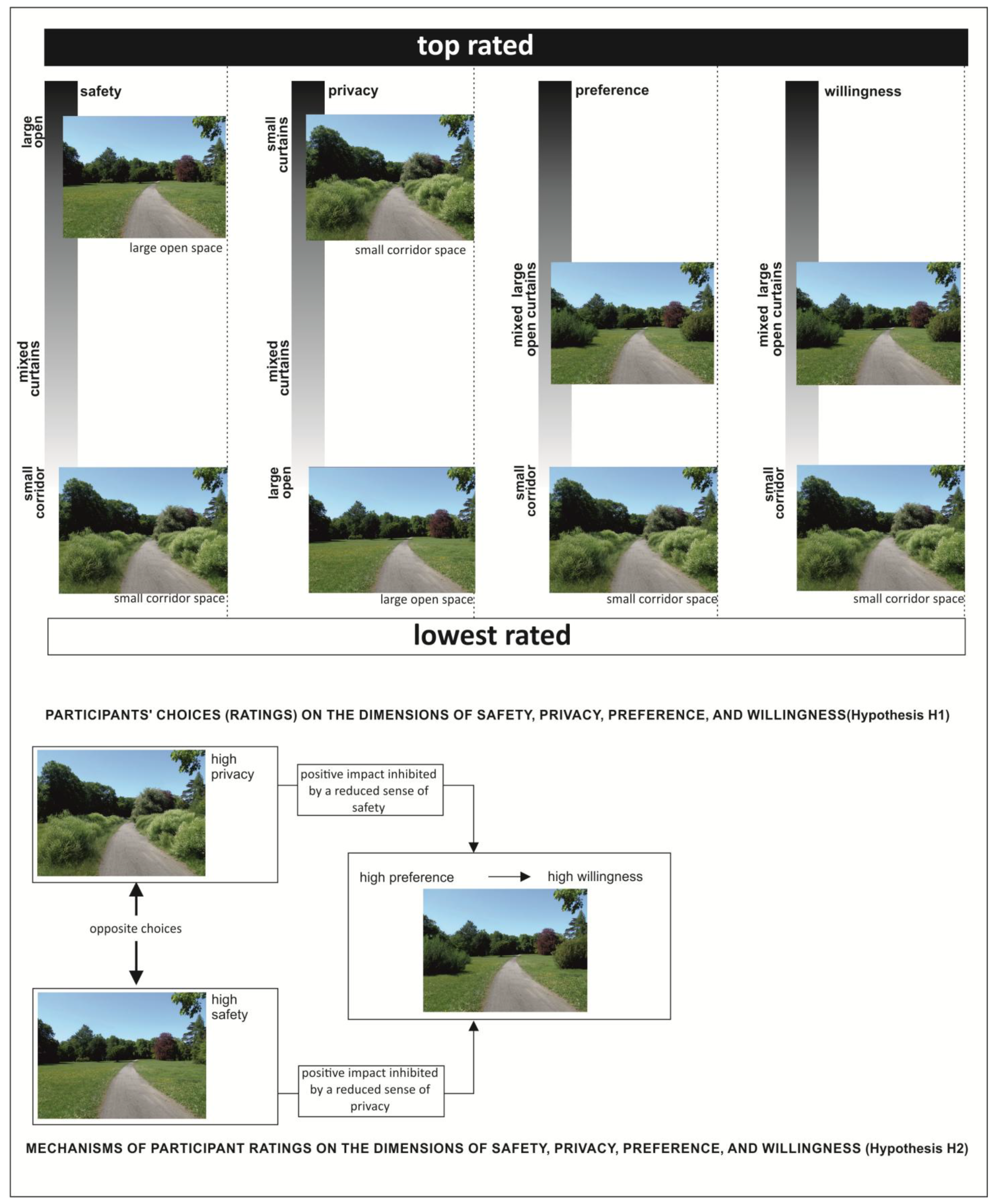 The theoretical foundations presented in the previous section also suggest that the relationships between the feelings that influence preference and willingness to spend time in a park (privacy and sense of safety) are still ambiguous. The sense of safety has a significant, often crucial, impact on preference, assuming that our preferences are determined by how a particular space may be conducive to survival. Following this line of thought, one may think that safe environments are always preferred as places for recreation. Moreover, perceived safety has been demonstrated to mediate the relationship between spatial barriers and regeneration, which is an important reason why people may want to spend time in a park [82,83]. This suggests that environments perceived as safe are more regenerative and potentially more conducive to intimate interactions and seclusion (privacy). In general, many studies have shown that a sense of safety is an important mediator of positive feelings, such as preference [39] or the ability to regenerate, as well as restore focus and mood [75]. Yet, at the same time, other research has revealed that the positive effect of safe spaces on preference is inhibited by the reduced privacy [39,40] or mystery [70] (that accompanies these spaces. In extreme cases, opposing actions of safety and privacy (or mystery) may significantly undermine or even destroy the positive influence of a sense of safety on preference [38].