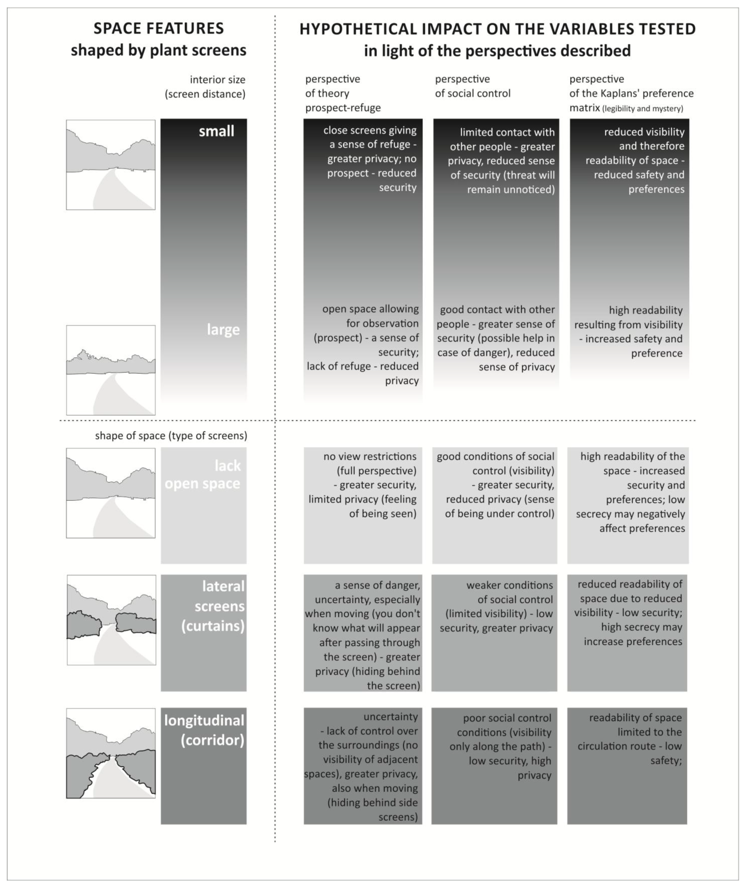 Finally, a perspective that may not directly relate to a sense of threat or privacy, but one that has made a well-established contribution to understanding landscape preferences, is the Kaplan Preference Matrix [60,61] (especially the part that refers to 3D factors. The matrix of the four ‘informational variables’ influencing landscape preferences involved in this theory is of two types: factors operating in 2D space (coherence and complexity) and factors operating in 3D space (legibility and mystery). The latter is particularly dependent on form and shape. Legibility affects how space is understood, helping us build mental maps in our minds [61,62], orient ourselves, and find our way back. This, in turn, has a significant impact on the sense of safety [46] inter alia, because it facilitates escape in the event of danger. Numerous studies on space legibility link it to openness and visibility [62,63,64], indicating that a lack of visual barriers has a positive effect on the sense of safety and, therefore, on preference [65]. Mystery, the second of the 3D factors from the Kaplan Preference Matrix, works differently in that it stimulates curiosity and, as a result, encourages exploration [66,67]. It also plays a biological role because exploration provides information about an area and all related situational circumstances necessary for survival. However, the factors influencing mystery are completely different, sometimes even opposite, to those that make a place legible. Mystery is positively correlated with barriers and viewing screens [63,64,65,68,69] because they obscure what is coming up next and make us want to proceed further into the landscape to satisfy our curiosity. Mysterious landscapes are attractive, although, in some circumstances, they may be less safe [70]. As we can see, the perspective of the Kaplan Preference Matrix does not clearly answer the question of whether viewing screens are liked.