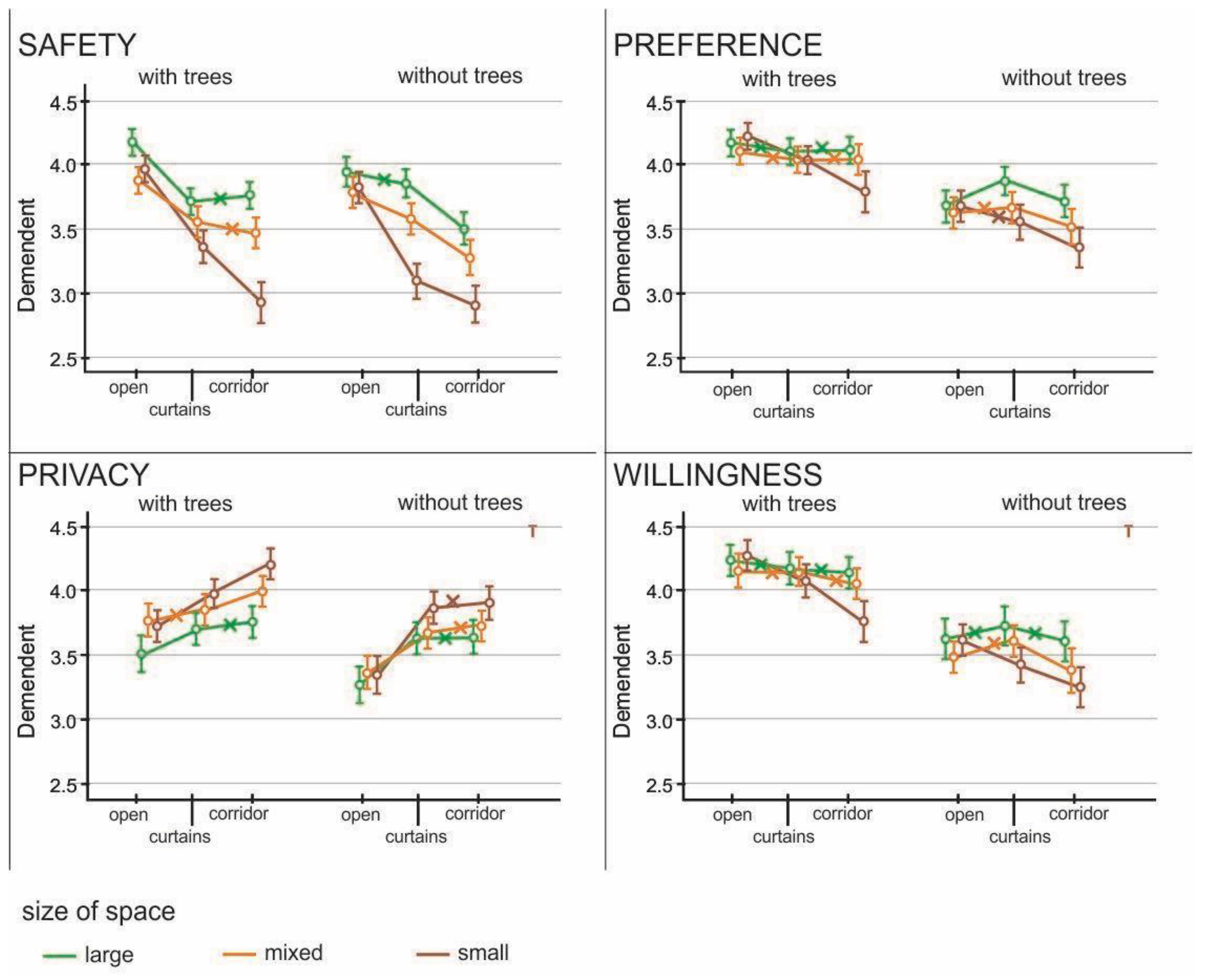 The location with trees was rated higher than the area without trees for all the variables. For the remaining factors (size and type of space), clear differences were observed (Figure 7). Open spaces were considered the safest. The addition of lateral (curtain) screens lowered the safety rating, and corridor spaces with longitudinal (corridor) screens were considered the least safe. The respondents conversely assessed the different spatial configurations when it came to privacy. They considered corridor space to be the most private, whereas spaces with lateral (curtain) screens were rated lower, and open spaces were thought to offer the least privacy. While evaluating preference and willingness to spend time in a given area, the respondents did not differentiate between open spaces and areas with lateral (curtain) screens; only corridor space was rated lower.