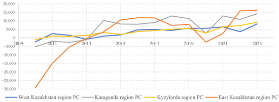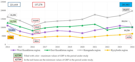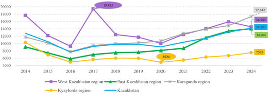 The analysis of the GRP of the regions showed that the dynamics of the regions are identical to the general Kazakhstani trends only in two regions—West Kazakhstan and Kyzylorda. At the same time, the Kyzylorda region, having lost almost half of its GRP between 2014 and 2016, later developed in a relatively stable manner, although it still did not reach the 2014 level by 2024 (17% lower). For the Karaganda and East Kazakhstan regions, 2022 is marked by a significant decrease associated with the administrative-territorial changes carried out in Kazakhstan during that period. Both regions were divided into two parts with the formation of two new regions. However, despite this, unlike the other three regions, the Karaganda region was able to reach and exceed the 2014 level by 22%. According to the criterion of GRP per capita, the leader is the KRG with a volume of USD 17,342, although the highest value of this indicator was in 2017, equaling USD 19,412 (Figure 3).