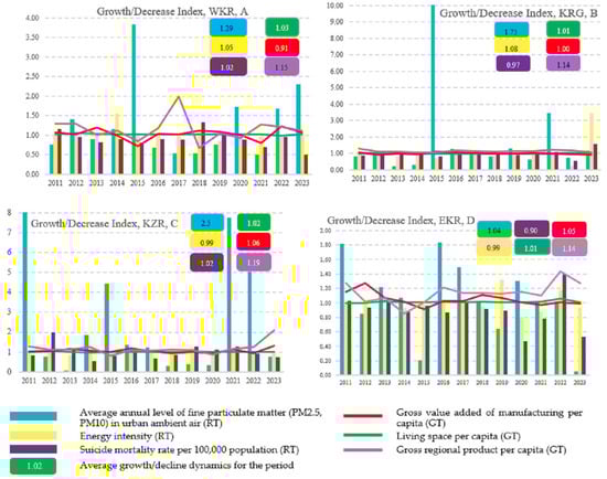 Growth/decrease index of sustainable development indicators in the regions of West Kazakhstan (A), Karaganda (B), Kyzylorda (C), and East Kazakhstan (D). Note: Compiled by authors, based on data from source [6].