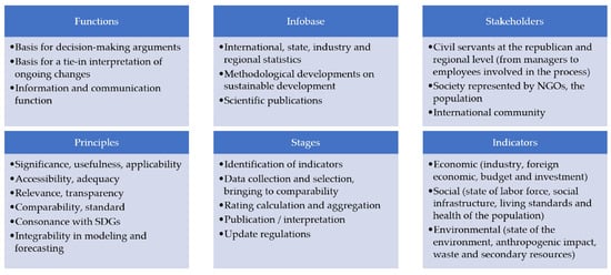 Within the framework of this study, the National Rating of Sustainable Development of Regions (NRSD) is based on a comparable and transparent assessment of economic, social, and environmental aspects of regional development. In order for the development of a region to be recognized as sustainable, it is important that the achieved economic growth is ensured in the context of preventing the deterioration of the environment of the region as a whole. The NRSD methodology is a set of components that determine its application in the process of assessing the level of sustainable development of a region. The components include the functions of the NRSD, the information base, the range of stakeholders, the principles of data selection, stages (rating processes), indicators, and rating calculation (Figure 5).