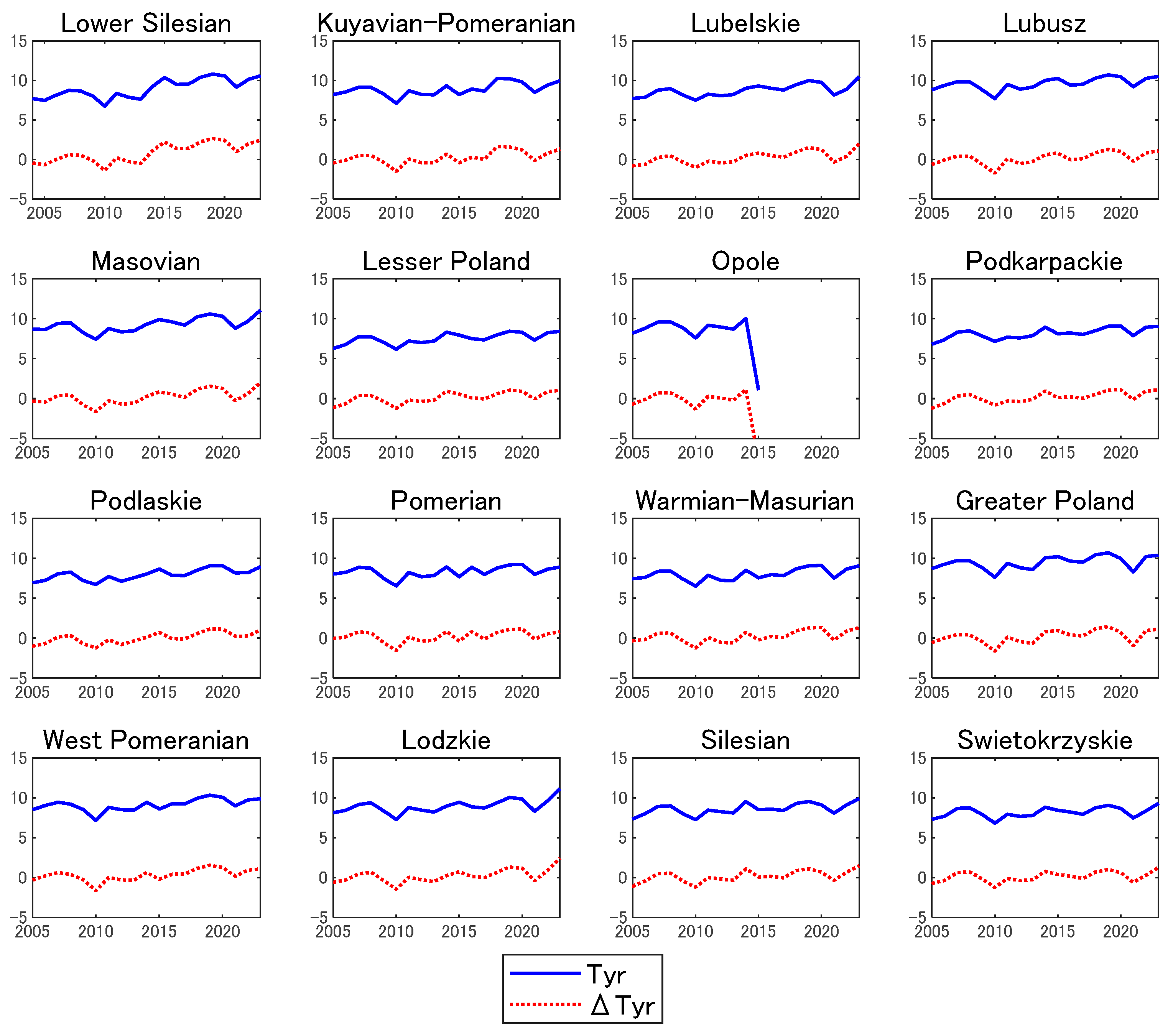 Average annual temperature and deviation of the annual temperature from the long-term average by region in the years 2004–2023. Source: own calculations based on the IMGW-PIB data. Note: Tyr—average annual temperature, ΔTyr—deviation of the annual temperature from the long-term average, Opole—temperature data available until 2015.