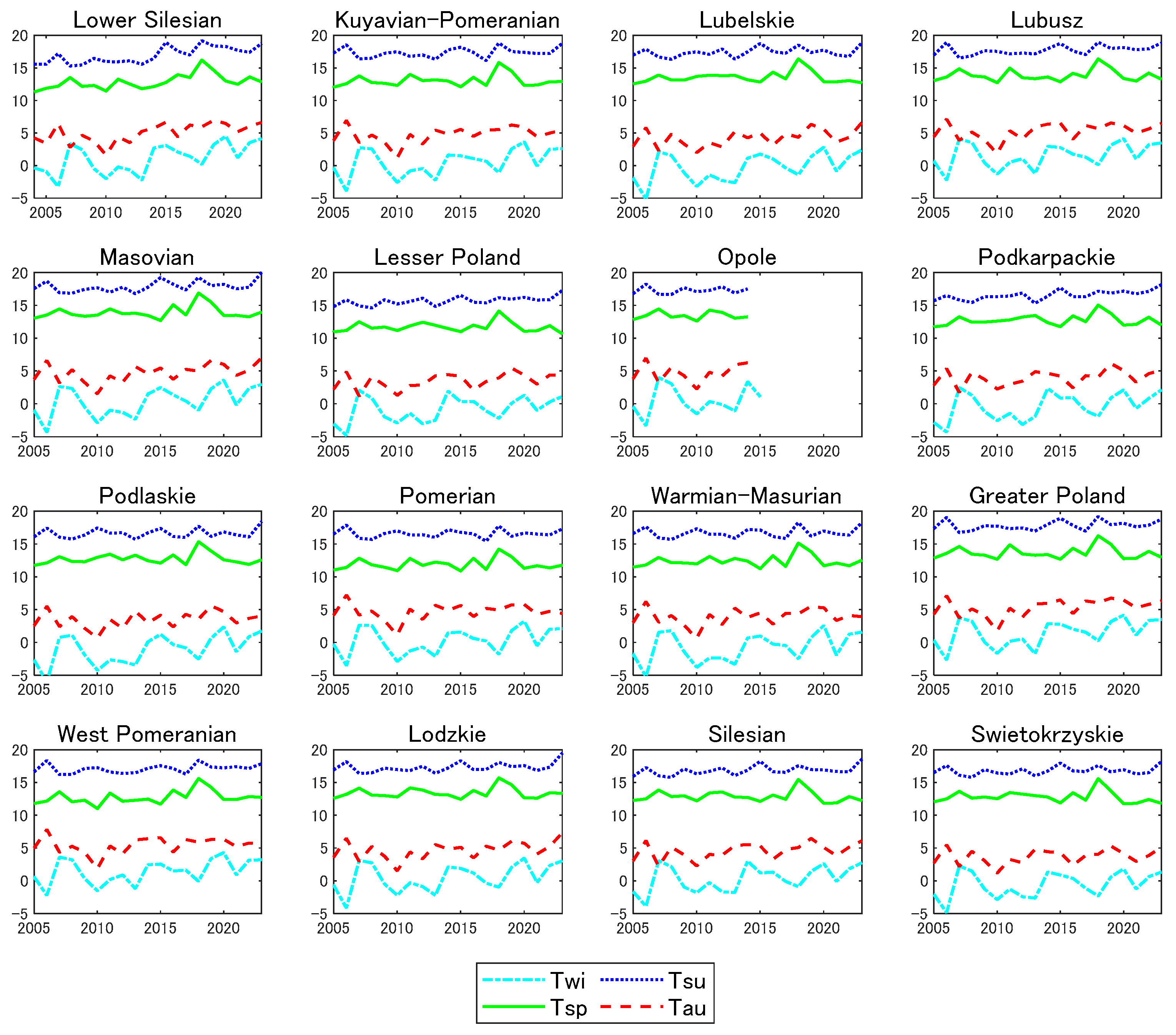 Average quarterly temperature by region in the years 2004–2023. Source: own calculations based on the IMGW-PIB data. Note: Tsp; Tsu; Tau; Twi—average quarterly temperatures in spring, summer, autumn, winter, respectively, Opole—temperature data available until 2015.