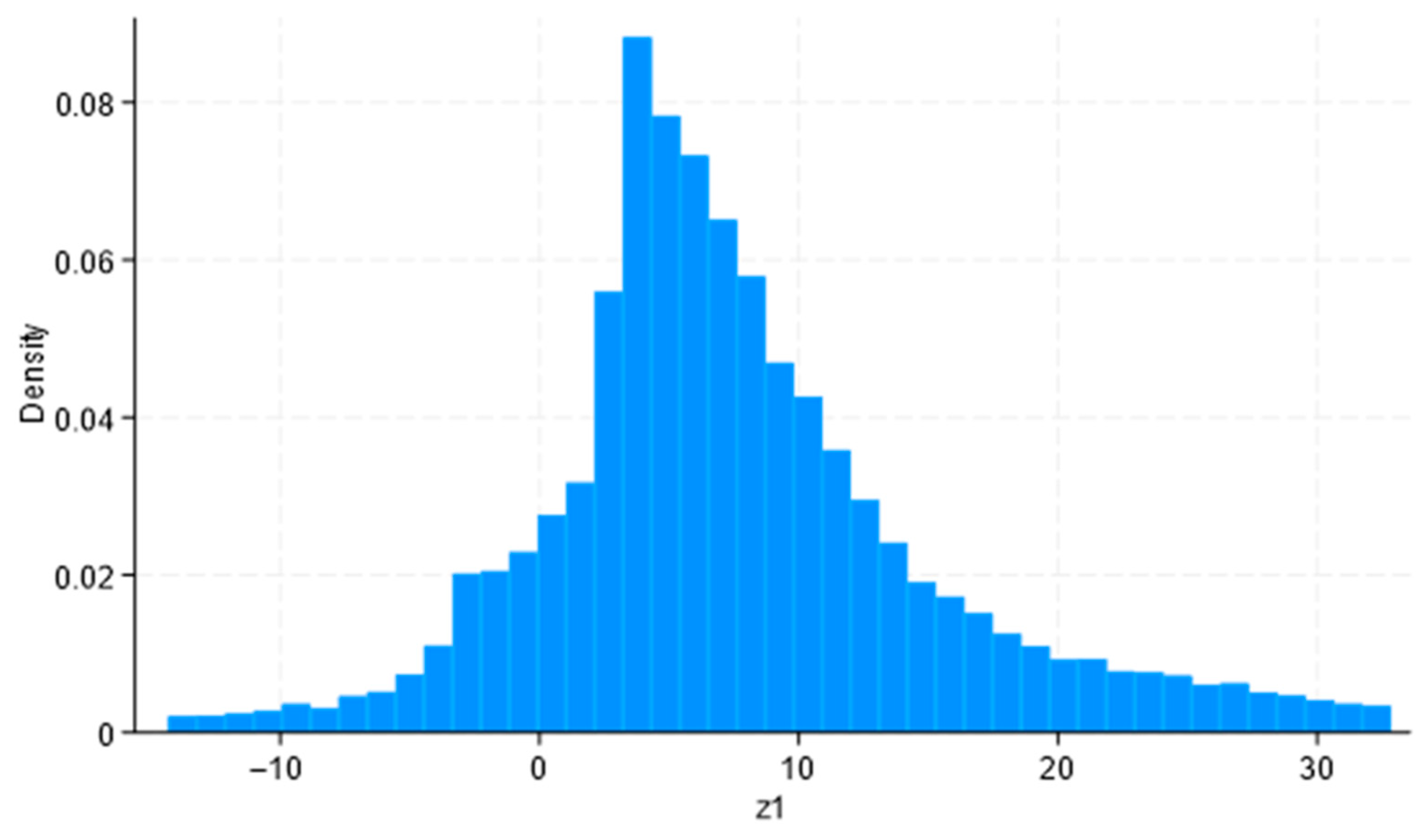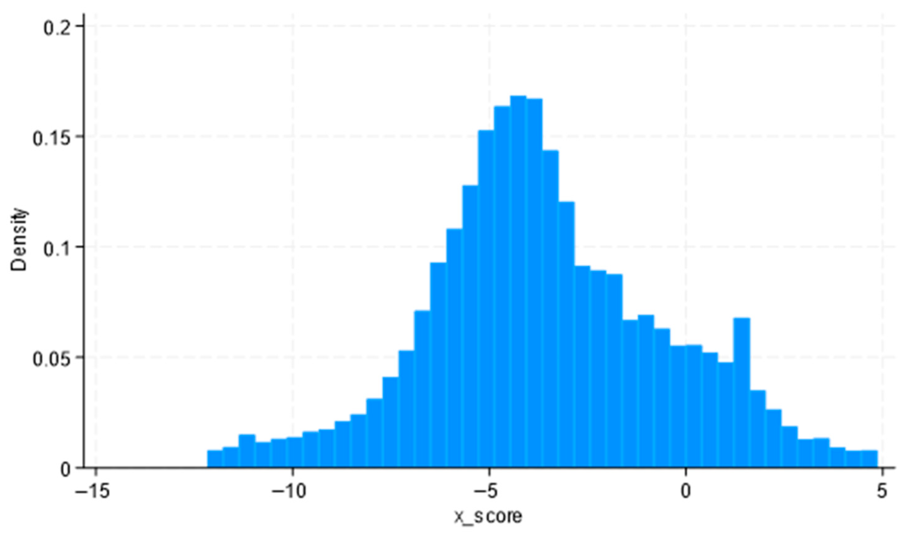 As a result, the research sample consists of enterprises whose primary area of activity is agriculture, including, among others: animal breeding, cultivation of cereals, legumes, fruit and vegetables, fishing, forestry and hunting (see Table 1). The distributions of the Z-score and X-score variables are generally similar, although minor differences are evident in the histograms (see Figure A1 and Figure A2).
