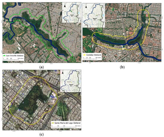 The study area comprises three urban wetlands in Bogotá, Colombia: Santa María del Lago, Juan Amarillo, and Córdoba. All are recognized as strategic ecosystems within the District System of Protected Areas and have been designated Ramsar sites due to their ecological importance [].
