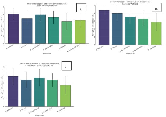 The comparative analysis of ecosystem disservice perceptions across the three urban wetlands evaluated (Córdoba, Santa María del Lago, and Juan Amarillo) reveals distinct patterns reflecting the specific environmental and social challenges of each site. In the Córdoba wetland, the highest perception levels were concentrated in the dimensions of “Dogs” and “Drugs” (Figure 2a,b). In contrast, Santa María del Lago displayed a relatively homogeneous distribution across the five dimensions analyzed, with a slight predominance of “Pollution” and “Drugs” (Figure 2c). The wide error bars in both cases indicate considerable response variability, possibly attributable to differences in exposure time, knowledge levels, or degree of direct contact with the evaluated factors.