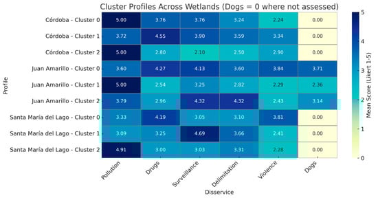 This heterogeneity was also evident in Juan Amarillo and Santa María del Lago, where some clusters concentrated critical perceptions around violence, drug use, or the presence of dogs. Notably, variability was observed in perceptions of stray dogs, which were only evaluated in Juan Amarillo: Cluster 0 showed higher scores (M = 3.71) compared to Cluster 2 (M = 2.16), indicating that this disservice is not perceived uniformly within the same wetland (Figure 3).
