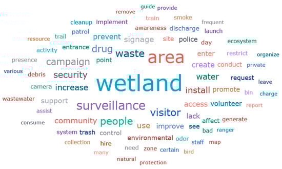 The responses to open-ended questions also enabled the collection of citizen proposals aimed at improving the use, enjoyment, and conservation conditions of urban wetlands. Through a lexical analysis conducted in ATLAS.ti, a word cloud weighted by frequency was generated, summarizing the recommendations made by visitors. The most prominent terms—‘surveillance’, ‘waste’, ‘security’, ‘community’, ‘install’, ‘campaign’, and ‘prevent’—reflect a clear demand for stronger control measures, awareness-raising strategies, and reinforcement of community cohesion (Figure 7).