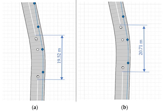 Road sections: (a) line break 19.52 m, curve 9.3°; (b) line break 20.71 m, curve 9.1°.