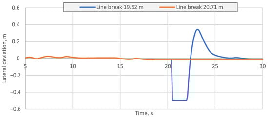 At the point where the horizontal markings end, the vehicle maneuvers within the lane. The lateral deviation on the road section of the road ranges from −0.5 m to 0.37 m, while the section of the road with a break line is 19.52 m (Figure 8). Once the cameras recognize the line ahead, the lateral deviation decreases.