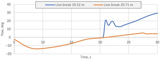 When analyzing the vehicle’s yaw, the LKA system’s maneuver can be seen (Figure 9) when a line behind the break is detected. At 21 s the yaw increases to 20.1°. After the LKA system centers the vehicle in the lane, the vehicle continues to travel in the center of lane.