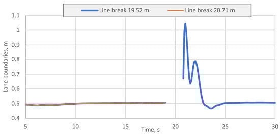 The simulation model imitates the temporary disappearance of road markings by replacing a section of road without markings. The length of the section without markings and the degree of the road curve are changed: in the first variant, the line break is 19.52 m, the curve is 9.3°, in the second variant, the line break is 20.71 m, the curve is 9.1° (Figure 5). These tests aim to determine the length of the section and the degree of the curve at which the LKA system will not detect the next line and will not perform the required maneuver.