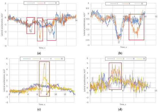 (a–d) Lateral acceleration of cornering vehicle with lane keeping control active on poor road condition (data from three–four real road tests).