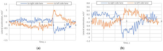 During field tests conducted in accordance with the EuroNCAP test protocol, when driving on a straight section of road and allowing the vehicle to approach horizontal markings at a transverse speed of 0.6–1.0 m/s, it was found that the LKA systems of all three tested vehicles detected the approaching lane in time. The EuroNCAP protocol specifies that when the systems return the vehicle to the lane center, the lateral acceleration must not exceed 1.0 m/s2, which is confirmed by the typical lateral acceleration characteristics obtained from measurements when the LKA system returns from the right and left sides (Figure 13).