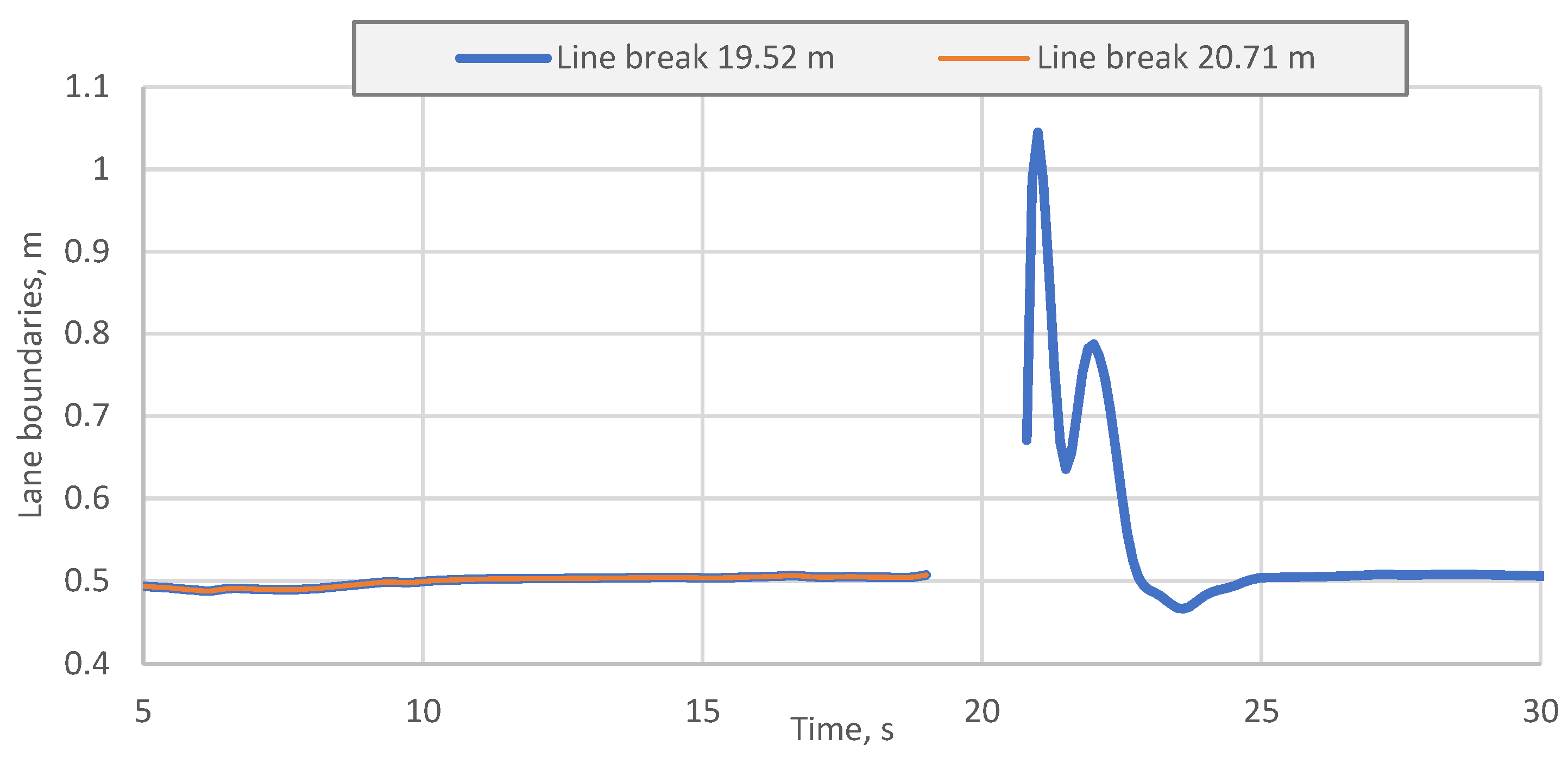 - Nguyen, B.; Famiglietti, N.; Khan, O.; Hoang, R.; Siddiqui, O.; Landerville, J. Testing and Analysis of Lane Departure Warning and Lane Keeping Assist System Response. SAE Int. J. Adv. Curr. Prac. Mobil. 2021, 3, 2301–2316. [Google Scholar] [CrossRef]