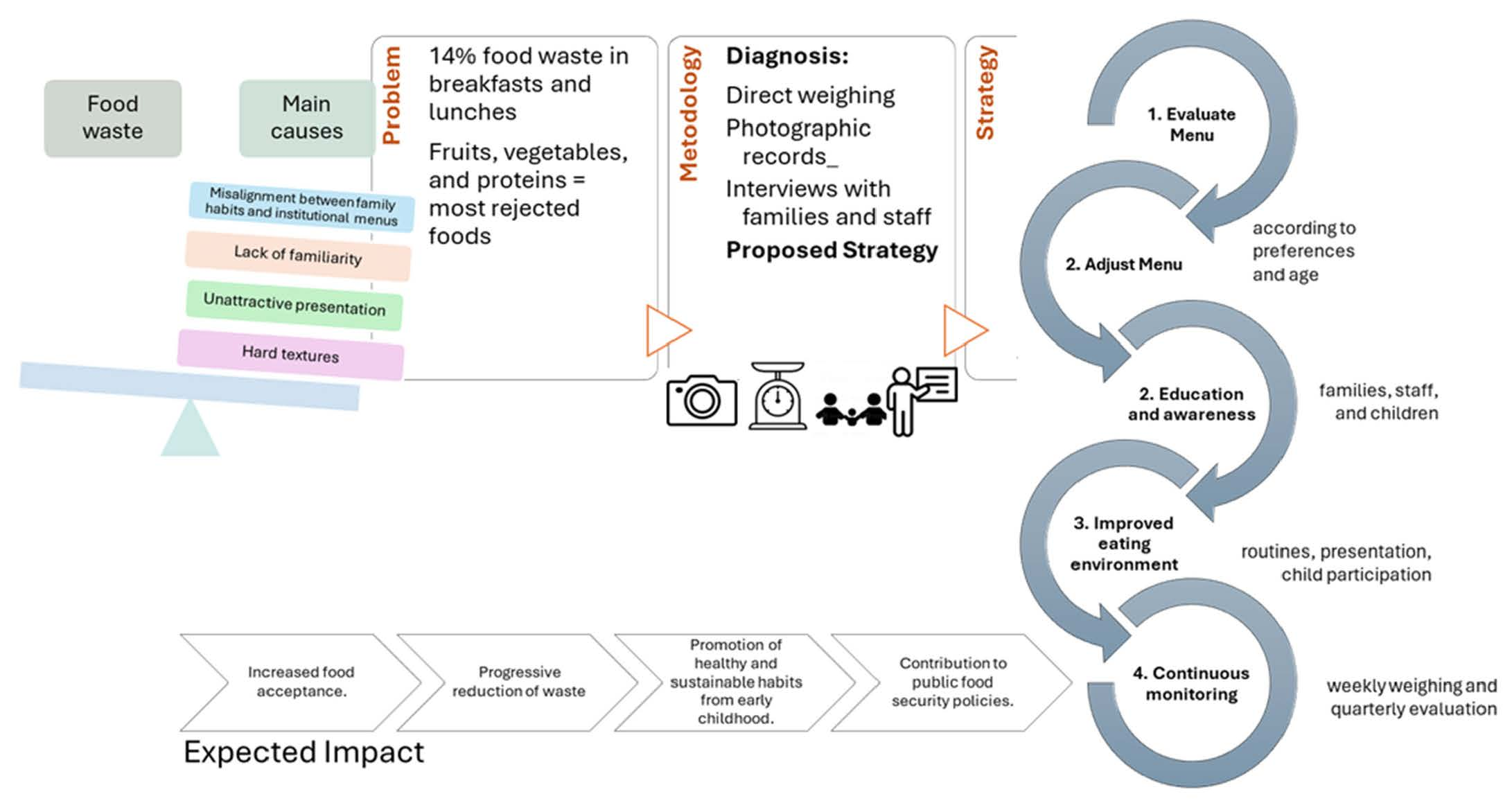 | 1. Data collection (evaluate menu) | 1.1 Review and adjust menus based on waste data. Modify food preparations and portion sizes according to waste patterns (e.g., replace boiled eggs with scrambled, serve ripe fruits, reduce dry foods). | Improve acceptance of critical items (proteins, salads, cereals) by adapting texture, portion size, and presentation to each age group. | Direct weighing matrix, portion size charts, observation logs, staff meetings. |