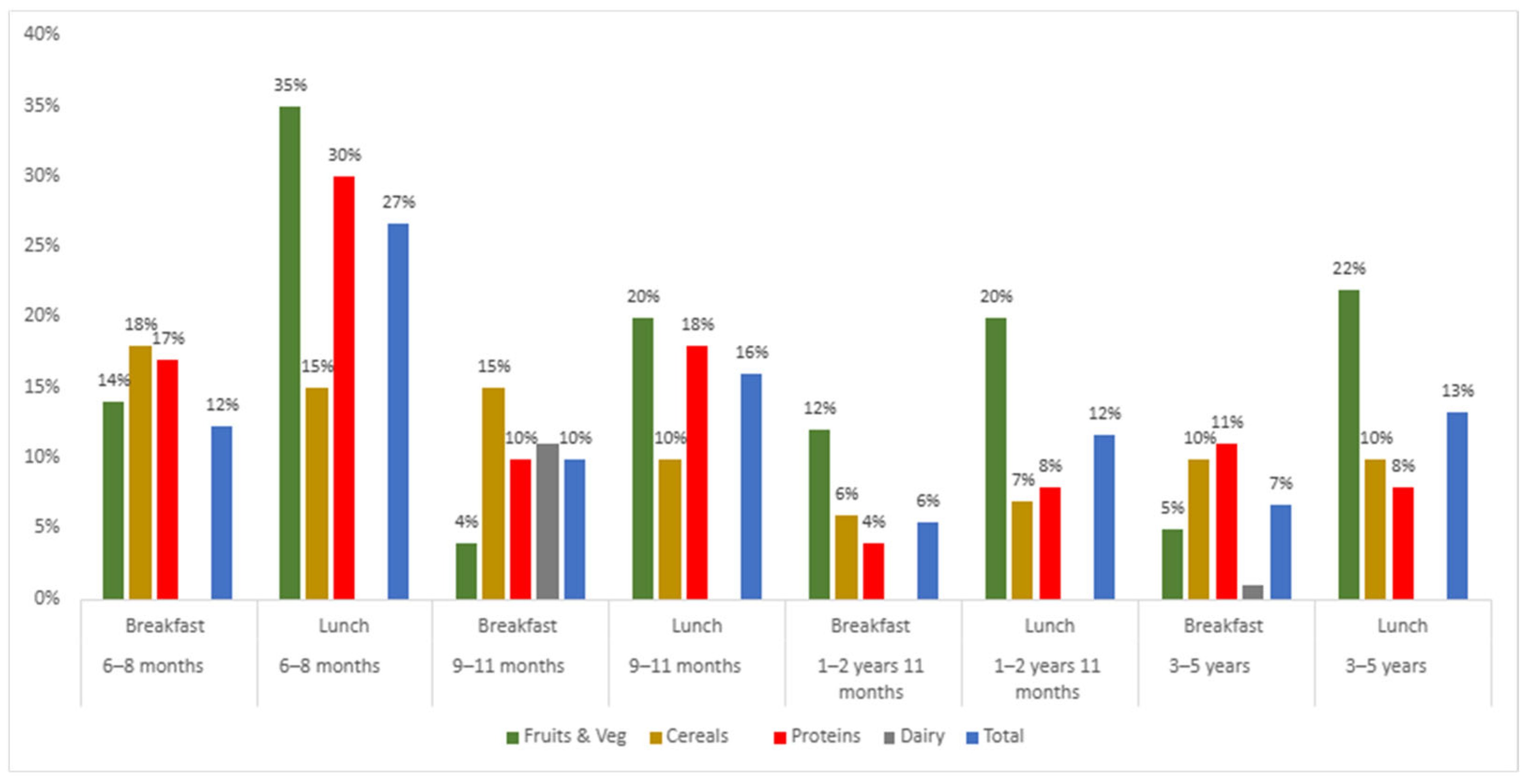 | 6–8 months | Breakfast | 0% | Blended egg | 3–5 yrs | Lunch | 24% | Grilled beef | ||