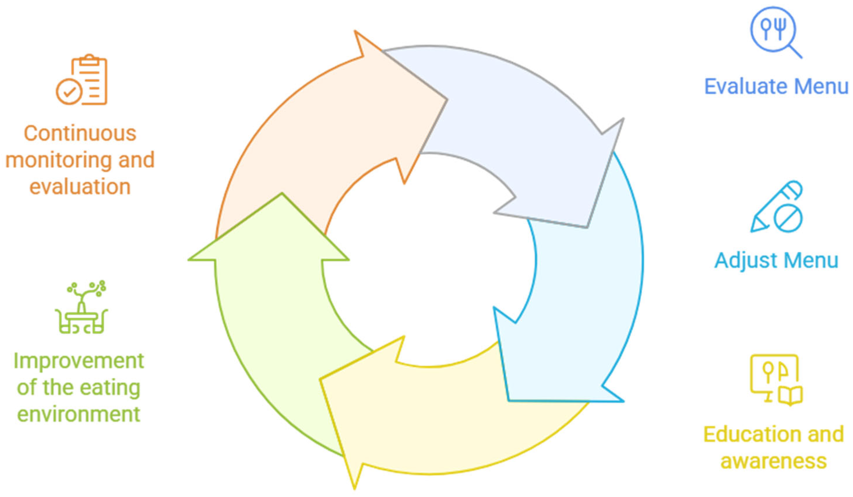 | Quarterly review of implementation impact. Evaluate behavioral changes and menu acceptance. | Ensure continuous improvement and evidence-based adjustments. | Evaluation tools (surveys, checklists), team meetings. |