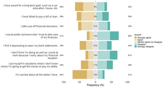Figure 4 presents the distribution of FWB responses for each question and illustrates the descriptive results of the eight items that comprise the questionnaire. The results indicate the financial landscape among the educators surveyed, with significant financial problems offset by some planning strategies.