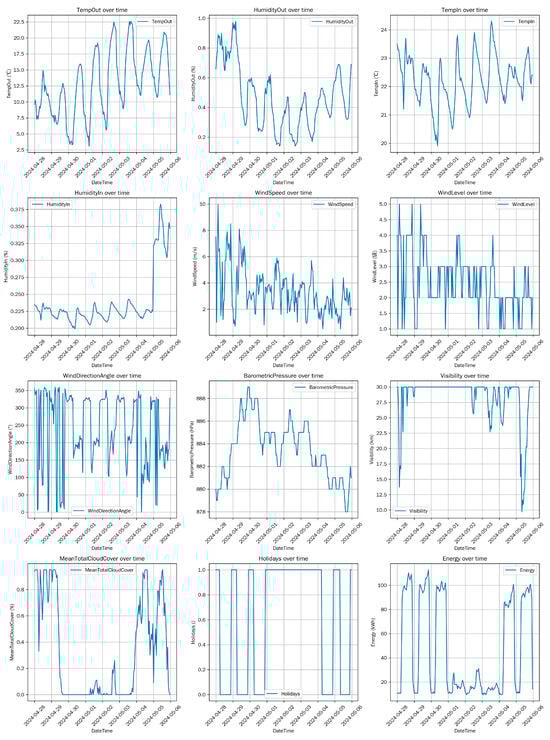 We selected the transitional period between spring and summer in Hohhot, a severely cold region, as the research space for energy consumption forecasting. Based on multi-factor considerations (Table 2), it was determined that public buildings in this area represent the typical energy consumption characteristics of public buildings in severely cold Zone I cities in northern China. The transitional period from 28 April to 5 May 2024 was selected, comprising 192 datasets as the preliminary research dataset. This period represents a critical phase where natural environmental regulation interacts with active building operations. Although the data span is brief, it comprehensively covers weekdays, weekends, and public holidays (including Labour Day), enabling effective capture of typical energy consumption fluctuations during transitional days. This makes it suitable for validating model architecture feasibility and short-term forecasting performance. Overall, the selection of the study subject provides a high-quality energy consumption sample for public buildings in cold northern regions, offering research value across multiple dimensions, including scale, layout, systems, management, and geography.