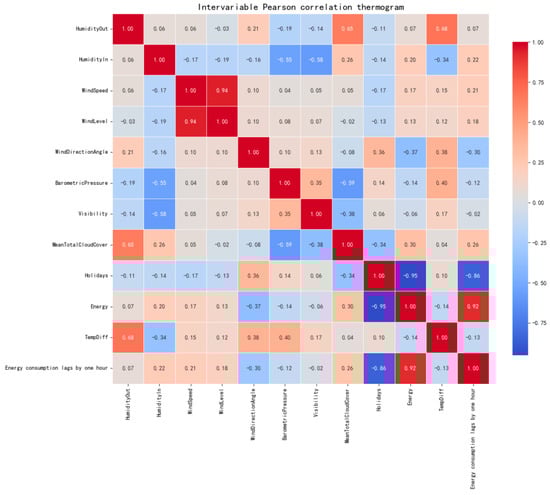 At present, twelve input parameters for the load forecasting model have been identified, each exerting varying degrees of influence on building energy consumption. Pearson correlation analysis heat maps (Figure 3) reveal significant correlations between the collected energy consumption data and multiple environmental factors. Energy consumption exhibits positive correlations with outdoor temperature, indoor humidity, outdoor humidity, and wind speed and a negative correlation with cloud cover. Specifically, energy consumption increases during daytime when temperatures rise, indoor humidity increases, outdoor humidity is high, or wind speeds are strong. Conversely, energy consumption decreases when cloud cover is greater. Furthermore, holiday periods significantly impact energy consumption: reduced footfall during public holidays leads to a substantial decrease in the number and duration of equipment operations, resulting in markedly lower energy consumption.