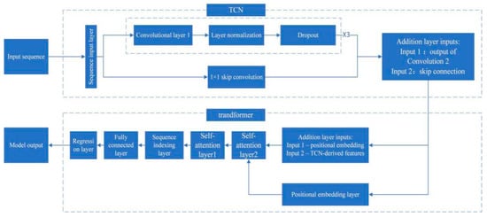 The TCN–transformer model also demonstrates outstanding performance in current research. Sheng Ruixiang and Zhang Xiaoyu proposed the TCN–transformer composite model, where TCN extracts spatial features while transformer captures long-term temporal dependencies. Validated on the DKASC dataset, this model effectively enhances short-term photovoltaic power prediction accuracy under varying weather conditions []. Zhang Hong and Li Feng et al. proposed the SolarFormer prediction method, optimising the encoder through feature selection and pyramid attention while enhancing the decoder by integrating TCNs with sunrise–sunset constraints. This approach significantly reduced RMSE, MAE, and SMAPE on the San Yō dataset []. Chen H et al. addressed early-stage time-series classification tasks by introducing a TCN–transformer framework to overcome RNN limitations. By integrating feature extraction and designing a balanced loss function, its effectiveness and accuracy were validated across ten datasets []. Nikhil Thapa et al. constructed a beat-tracking model combining transformers and TCNs, leveraging the former for capturing global dependencies and the latter for local patterns. It achieved performance comparable to state-of-the-art methods on multiple music datasets with fewer parameters while providing interpretability through Grad-CAM []. Linhan Wu et al. proposed a TCN–transformer hybrid model, combining TCN’s local pattern capture capability with transformer’s parallel processing advantage. Case studies validated its high accuracy and generalisation ability in time-series and large-scale photovoltaic data prediction []. Shengcai Zhang et al. introduced a wind speed prediction model based on VMD–TCN–transformer, utilising DBO to optimise signal decomposition. Experiments across three datasets demonstrated an average R2 improvement of 52.1%, with multiple error metrics outperforming six comparison models [].