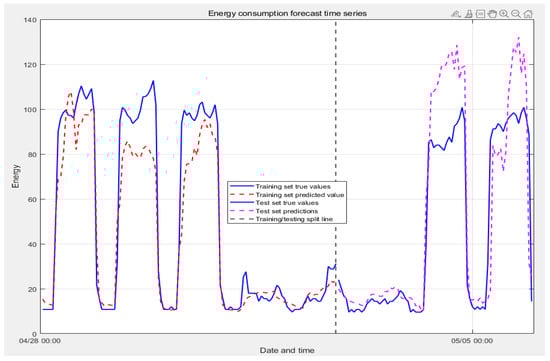 As shown in Figure 12, the TCN–transformer model demonstrates excellent performance in building energy consumption forecasting. On the training set, the solid blue line (actual training set values) closely aligns with the dashed red line (predicted training set values), indicating the model fits the training data well and accurately captures energy consumption trends. On the test set, the solid blue line (actual test set values) remains relatively close to the dashed pink line (predicted test set values). Although discrepancies exist and certain peaks are not entirely accurate, the overall trend aligns, demonstrating the model’s generalisation capability and predictive performance on unseen data. This indicates that the TCN–transformer model is suitable for building energy consumption forecasting tasks, providing reliable support for energy conservation management.
