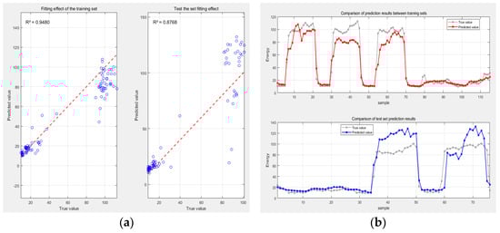 (a) Comparison of training and test set results.(The blue dots represent the correspondence between the actual predicted values and the true values for each sample; the red line indicates the reference line for perfect prediction.) (b) Fitting comparison chart of training set and test set.