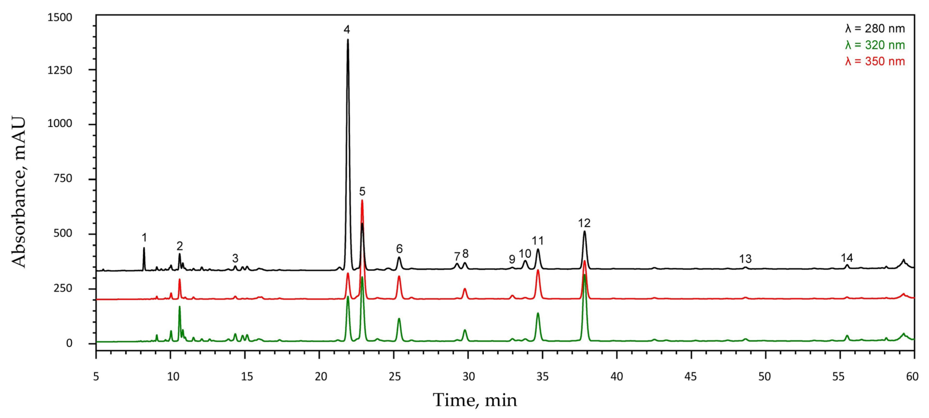 Mentha × piperita extract was further characterized using HPLC-DAD. Based on chromatographic and spectroscopic data, comparison with commercially available standards, and literature reports [