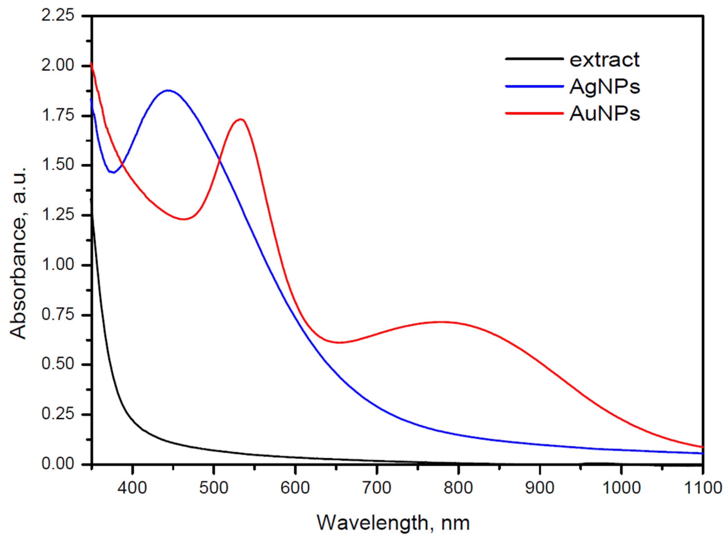 Mentha × piperita) leaf extract was used for the green synthesis of AgNPs and AuNPs. The extract concentration in the obtained NP solutions was 250 mg·L