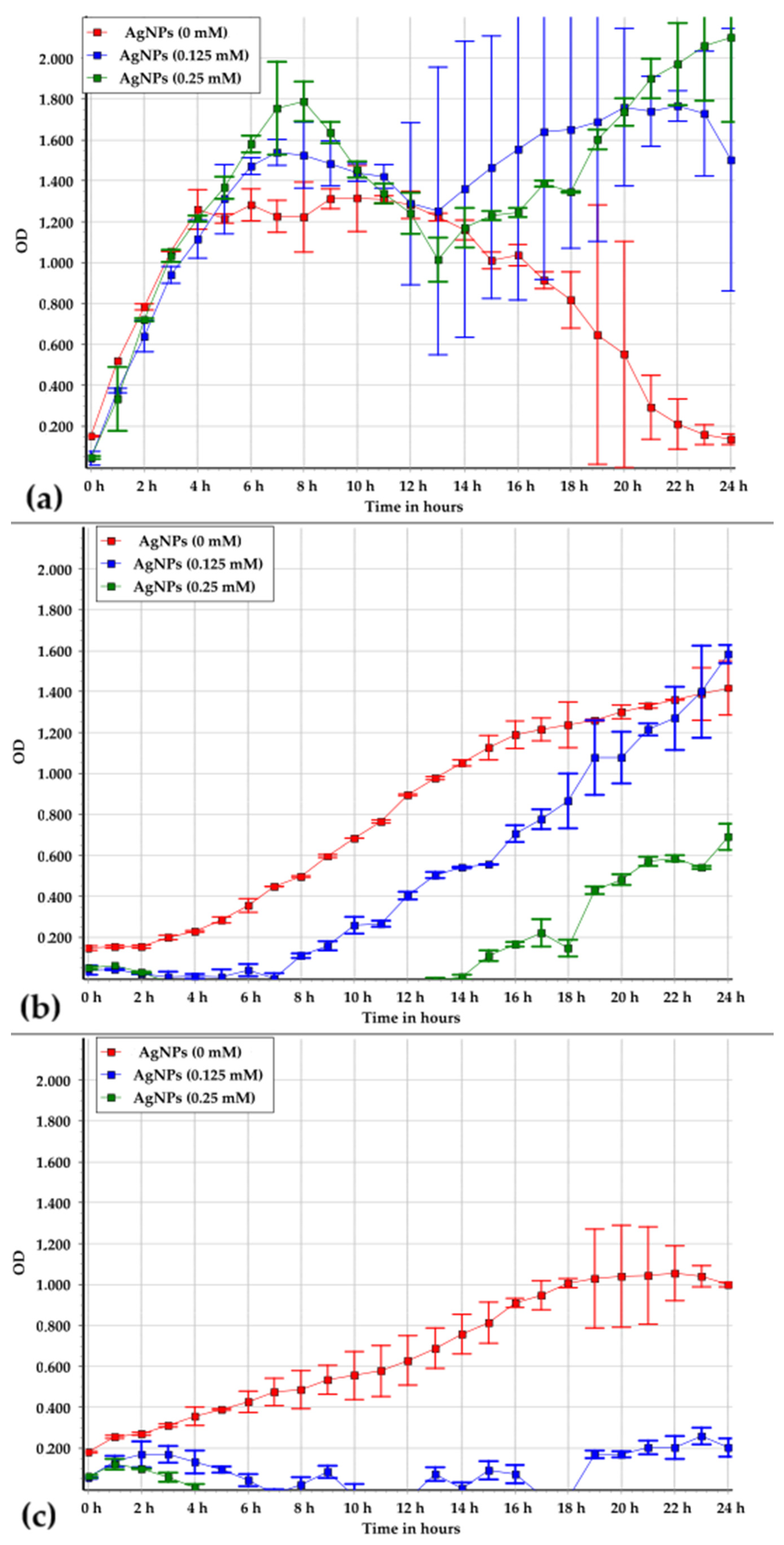 The analysis of the growth curves revealed that AgNPs inhibited the growth of the studied strains to varying degrees. The effect of AgNPs on
