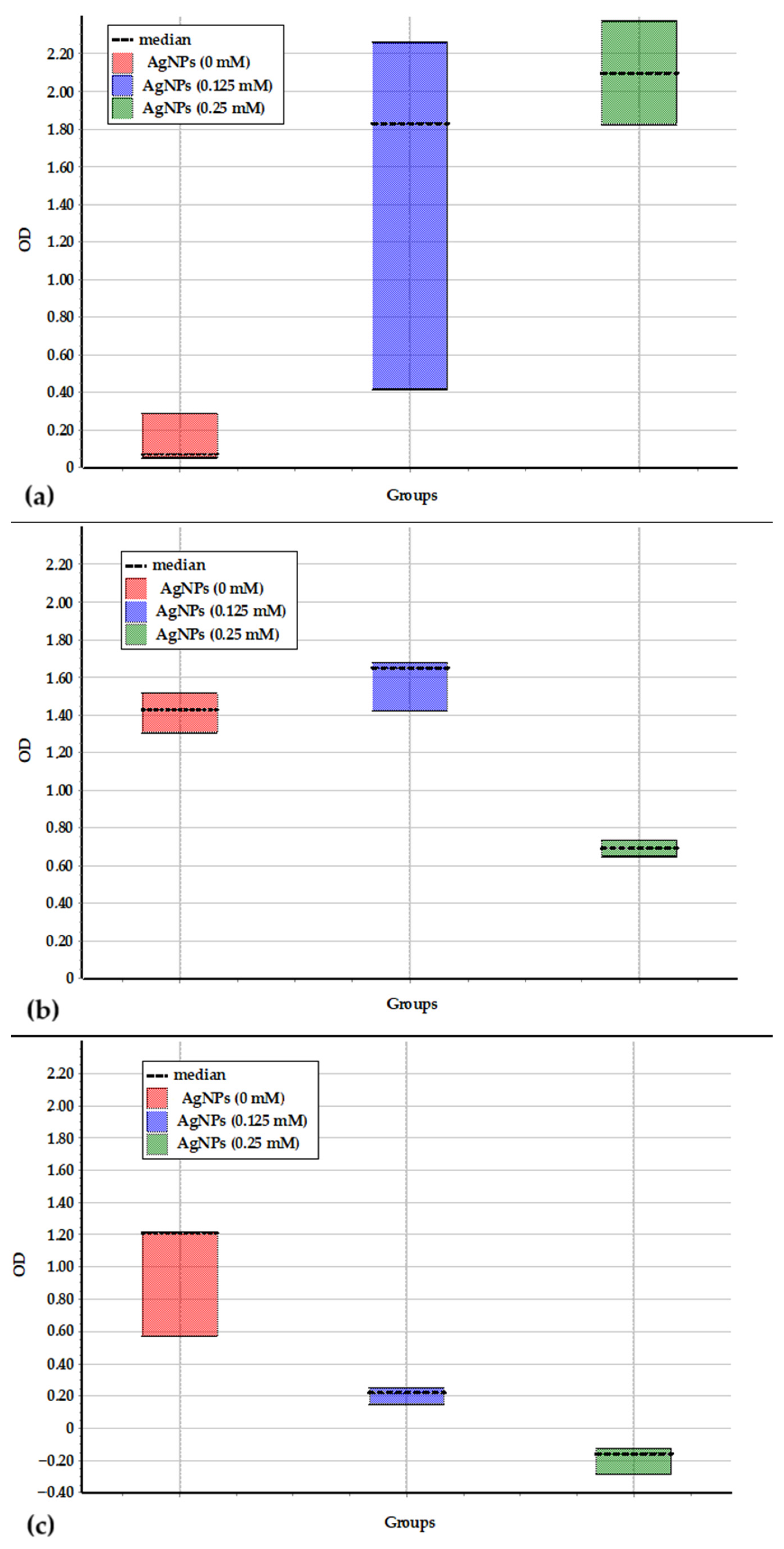 Figure 5b). No significant difference was detected between growth without metal NPs and with 0.125 mM AgNPs, confirming the strain’s resistance to 0.125 mM but sensitivity to 0.25 mM AgNPs.