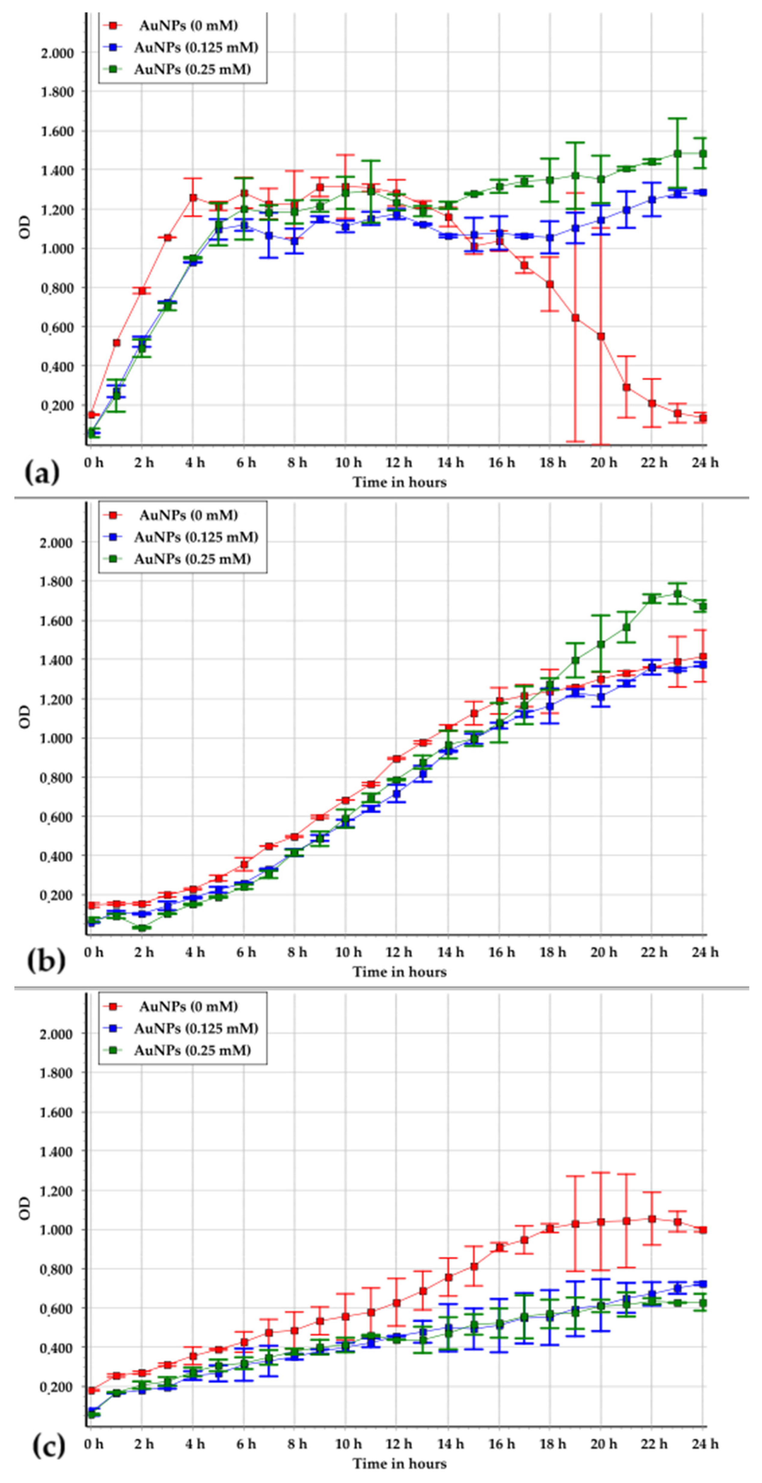 The analysis of the growth dynamics of the studied strains in the presence of AuNPs revealed distinct patterns.