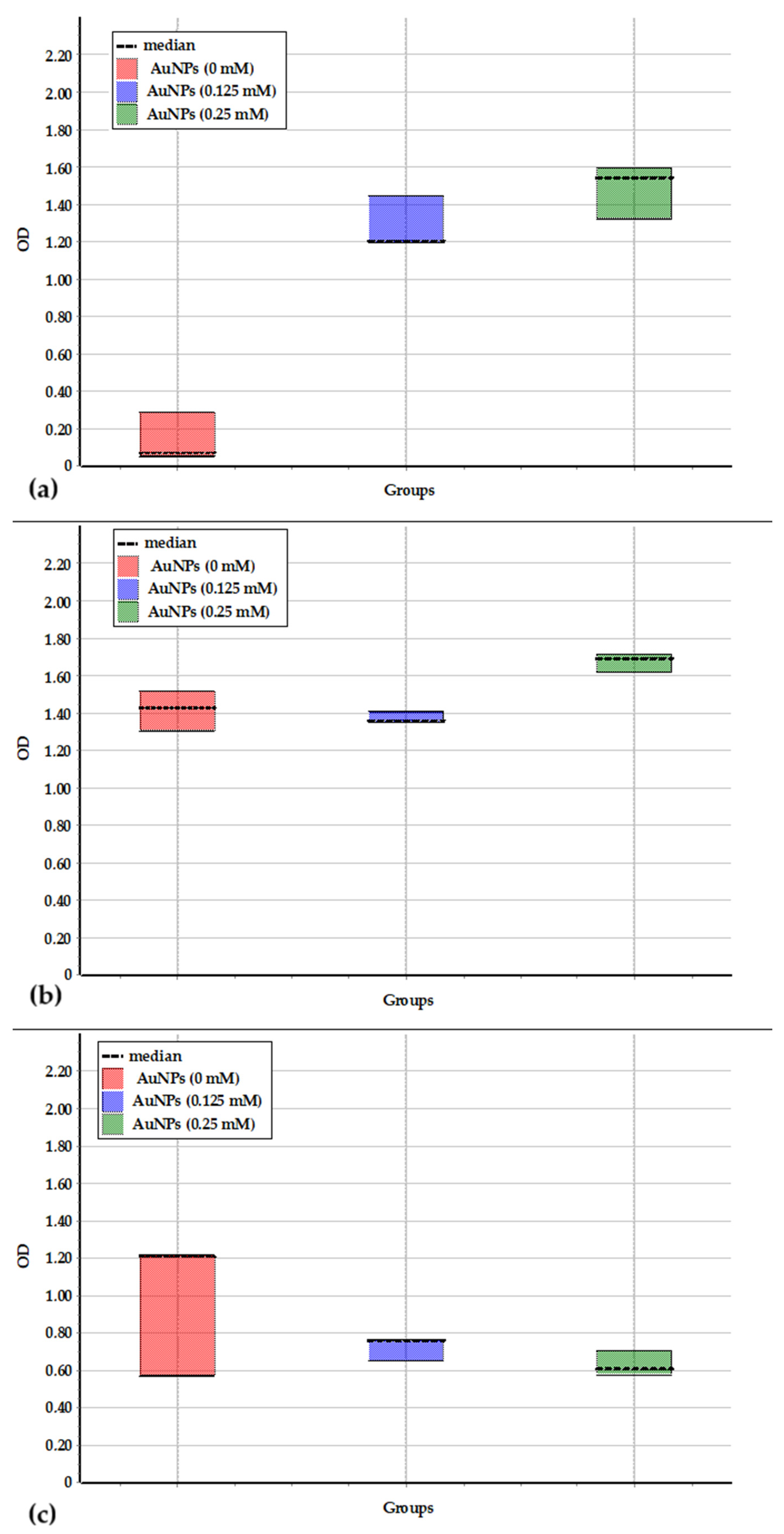 Figure 6c). Nevertheless, statistical analysis revealed no significant difference between the growth data with and without AuNPs (