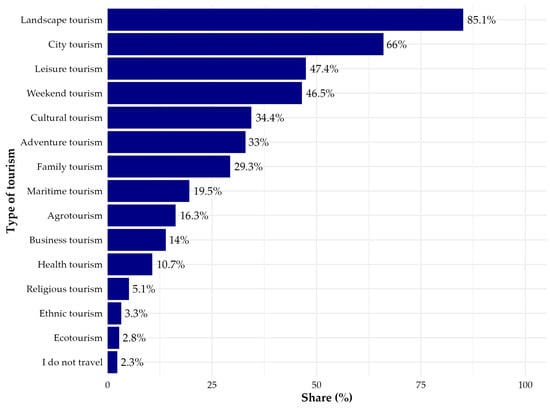 As shown in Figure 3, the most frequently selected type was landscape tourism (85.1%), followed by city tourism (66%). Almost half of the respondents also indicated leisure tourism (47.4%) and weekend tourism (46.5%). Among the least popular categories were religious tourism (5.1%), ethnic tourism (3.3%), and ecotourism (2.8%). A small number of participants declared no travel (2.3%). Although respondents declared the strongest preference for landscape tourism, the destinations they most frequently named were large urban centers. This discrepancy suggests that while travelers value nature-oriented and sustainable forms of tourism in the abstract, iconic global cities dominate when concrete destinations are considered.