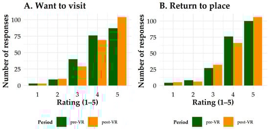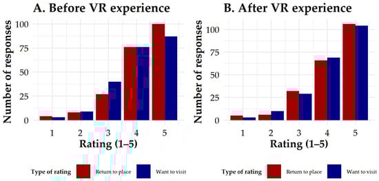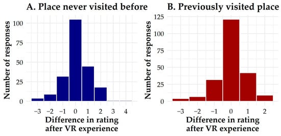 Figure 1 visualizes the spatial distribution of all indicated destinations on a world map, divided into places already visited and places participants wished to visit. The map reveals a strong concentration of revisited destinations in Europe, reflecting geographical proximity and established travel patterns within the sample. By contrast, aspirational destinations are more globally dispersed, spanning North America, Asia, and Oceania. This pattern suggests that VR was perceived as an opportunity to explore remote and less accessible locations. The spatial contrast highlights the potential of VR applications in responsible tourism: providing immersive access to culturally and geographically distant sites while reducing the environmental costs of long-haul travel. Such applications can serve both as an educational tool and as a means of encouraging more sustainable travel behavior.