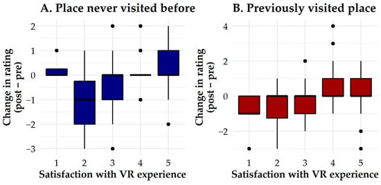 Higher satisfaction with the VR experience is associated with a greater increase in willingness-to-visit (Δ = post-VR minus pre-VR).