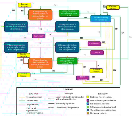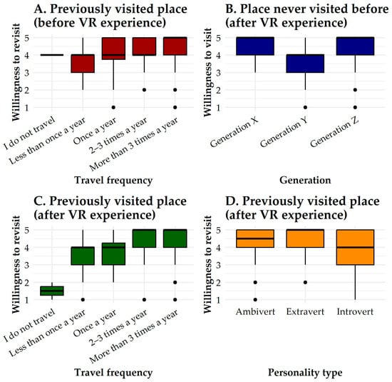 Individual characteristics (gender, generation, education, personality type, VR use frequency, travel frequency, headset type) significantly differentiate willingness-to-visit (pre-VR, post-VR).