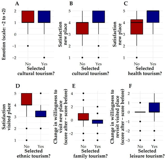 For the purposes of analysis, willingness was therefore represented by four variables (want to visit pre and post, revisit pre and post) and by two difference scores (Δ want, Δ return). Satisfaction was assessed for both types of destinations, while emotion was treated as a single ordinal variable. In addition, binary indicators were created for each declared type of tourism preference to enable comparison between those who selected a category and those who did not.