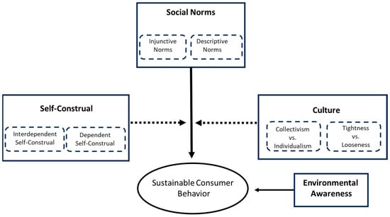 In doing so, this paper directly responds to calls in the literature, including an earlier review in Sustainability [], for frameworks that move beyond fragmented evidence and place social norms at the center of explanations of sustainable behavior. By highlighting the interplay of social norms with culture, self-construal, and environmental awareness, the proposed model provides a theoretically grounded basis for future empirical validation and practical application, serving as a conceptual foundation for subsequent empirical research.