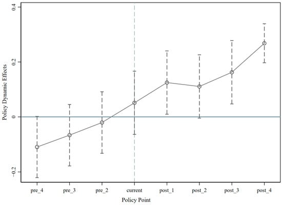 The parallel trend test. Note: The horizontal axis represents time relative to the policy implementation year. Pre_4 to pre_2 denote the fourth to second years before policy implementation, while post_1 to post_4 denote the first to fourth years after policy implementation. The vertical axis shows the estimated coefficient of the difference in green innovation capacity between the treatment and control groups, with vertical lines indicating the 95% confidence interval.