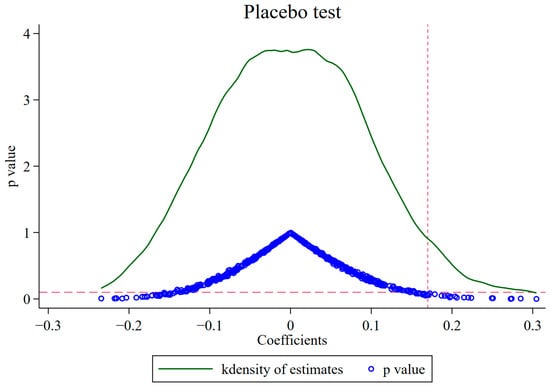 After referring to the practices of previous scholars [48], this paper generates an experimental group randomly for a placebo test to determine whether other random factors cause the empirical results. Specifically, 192 enterprises were randomly selected from the original sample as the experimental group affected by the Guidelines, while the remaining enterprises were categorized into the control group. Regression analysis is then conducted after the above processing. To ensure the robustness of the experiment, this paper repeats the random sampling process 500 times and produces a scatter plot of the estimated coefficient and its corresponding p-value.