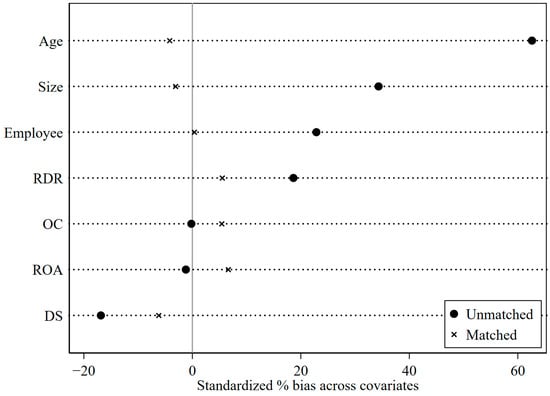 Before the implementation of the Guidelines, there were differences in basic characteristics between enterprises affected by the Guidelines and those not affected, which might result in inherent disparities in green technological innovation between the two groups, reducing the accuracy of the DID estimates. Therefore, this study employs the PSM-DID method to reanalyze the policy effect. Following the matching approach of previous studies [49], this study uses control variables as matching covariates. It conducts a nearest-neighbor matching with replacement at a ratio of 1:3 yearly.