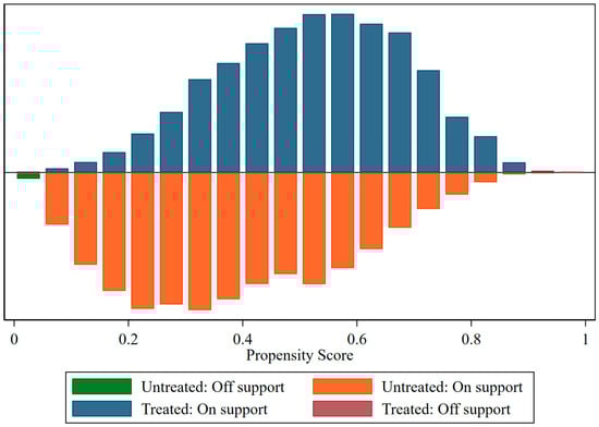 This paper conducts balance tests and the standard support hypothesis test to validate the quality of propensity score matching. The balance test results in Table 4 indicate a significant reduction in the absolute values of standardized deviations of matched feature variables. Moreover, in Figure 3, the vertical axis represents the selected covariates, while the horizontal axis displays the standardized bias across covariates. The standardized deviations of all covariates are below 10% after matching. What is more, Figure 4 presents the results of the common support hypothesis test. The horizontal axis displays propensity scores, while the vertical axis shows density. The blue column indicates successfully matched treatment group samples, and the orange column represents selected control group samples. The blue and orange columns exhibit high overlap in the mid-range of propensity scores. The results above indicate a satisfactory matching effect.