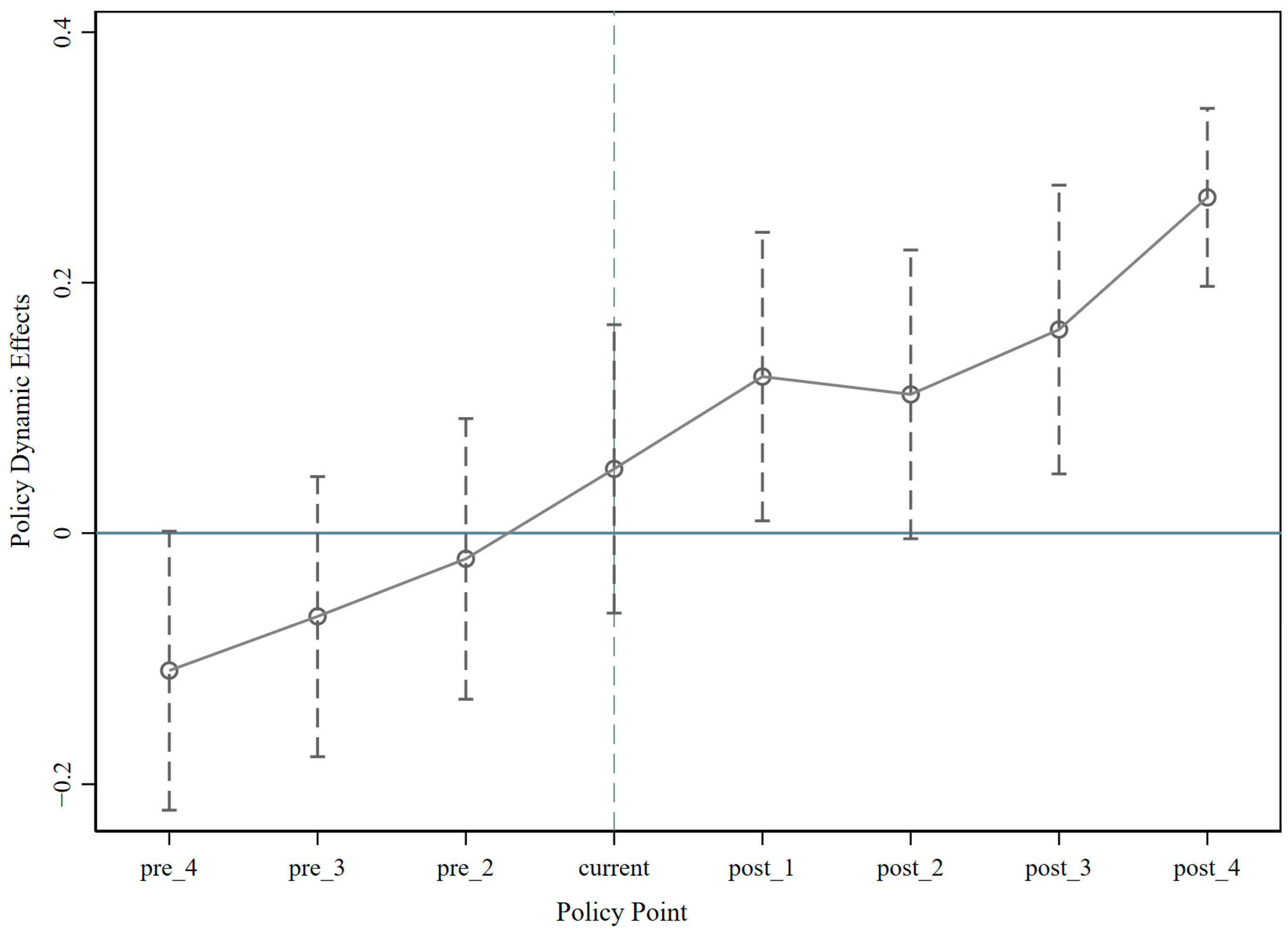 Figure 1 plots the time trend of the difference in the number of green utility patent applications (GUP) between the experimental group and the control group. The confidence intervals for the estimated coefficients of the interaction terms all contain 0 before the implementation of GCP. However, after 2012, the estimated coefficients largely display positive values. These findings indicate that there was no significant difference in the level of green technological innovation between the experimental and control groups before the implementation of the Guidelines in 2012, which suggests that the study meets the parallel trend assumption.