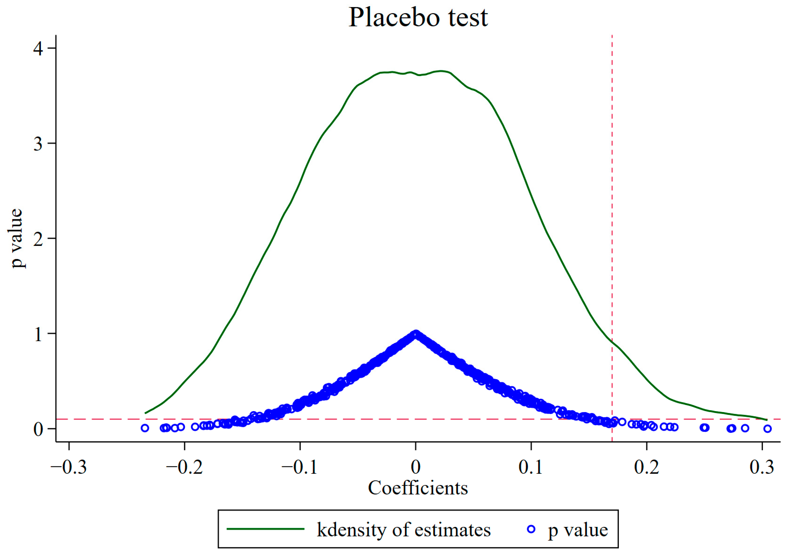 Figure 2, the coefficients are centrally distributed around 0, but are significantly different from the true value. Moreover, most scatters are above 0.1, indicating that most estimates are insignificant at the 10% confidence level. The above results show that the improvement of green technological innovation in HPEs is not driven by random factors, confirming that the empirical results in the previous section are robust.